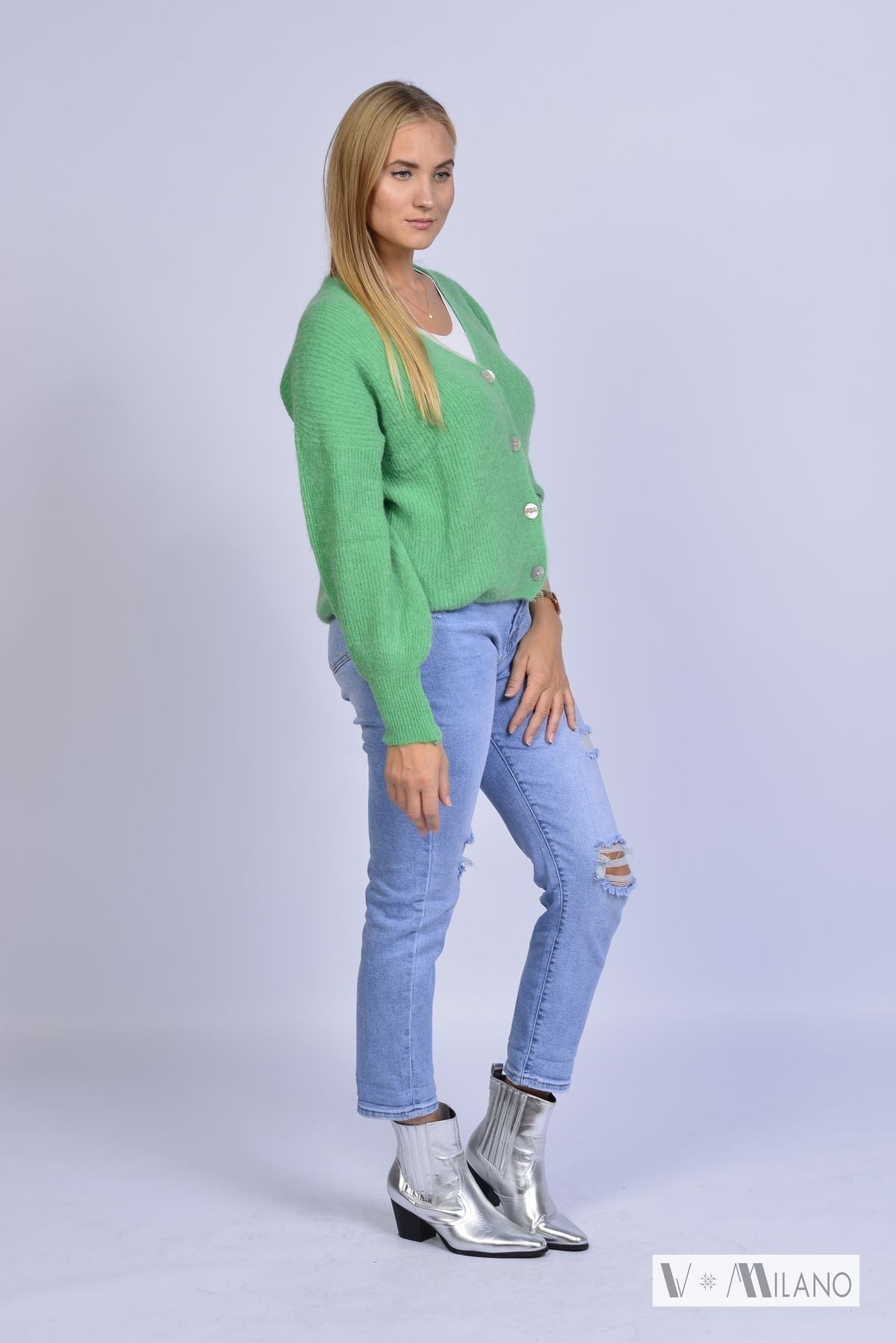 Der feminine V-Ausschnitt, die feinen Knöpfe und die locker fallende Passform machen diese Strickjacke zu einem vielseitigen Styling-Piece – perfekt für elegante Alltagslooks oder moderne Layering-Outfits.